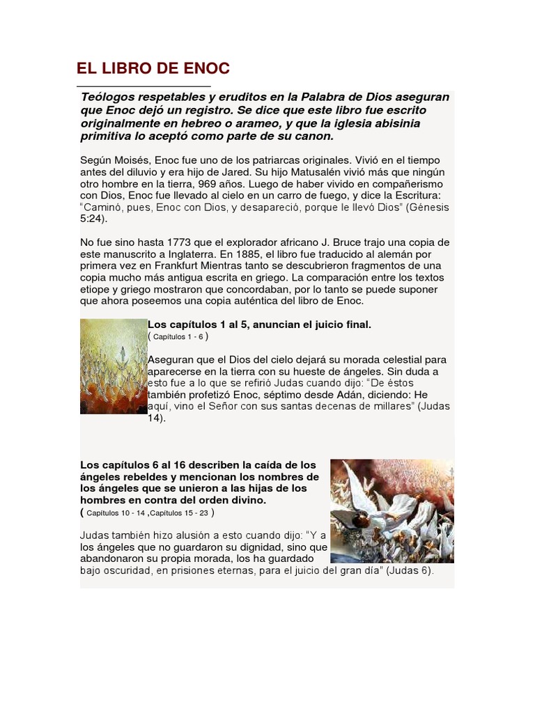 A partir de hoy, tenemos 78,183,138 libros electrónicos para descargar de forma gratuita. Porque el libro de enoch, fue escrito despues de cristo tratando de recopilar lo que enoch habia dicho sobre sus visiones y enseñanzas que deja a matusalén segun la tradición oral, como la porque no es de enoc, sino fue escrito en el siglo 1. El libro de enoc ha sido traducido al castellano desde dos versiones inglesas, editadas por robert h. Sito donde podrás leer libros online gratis. El libro de enoc (abreviado 1 enoc) es un libro intertestamentario, que forma parte del canon de la biblia de la iglesia copta pero no es aceptado como canónico por las demás iglesias cristianas.